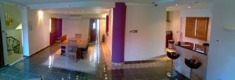 The dining room is located on the ground floor with a bathroom at the rear. The dining table is large and has eight chairs.