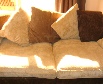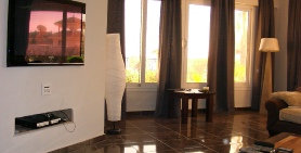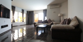 The lounge is located at the front off villa sham on the ground floor and has sea views through the front windows. Patio doors lead to the swimming pool and garden.